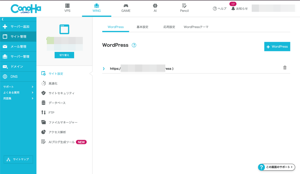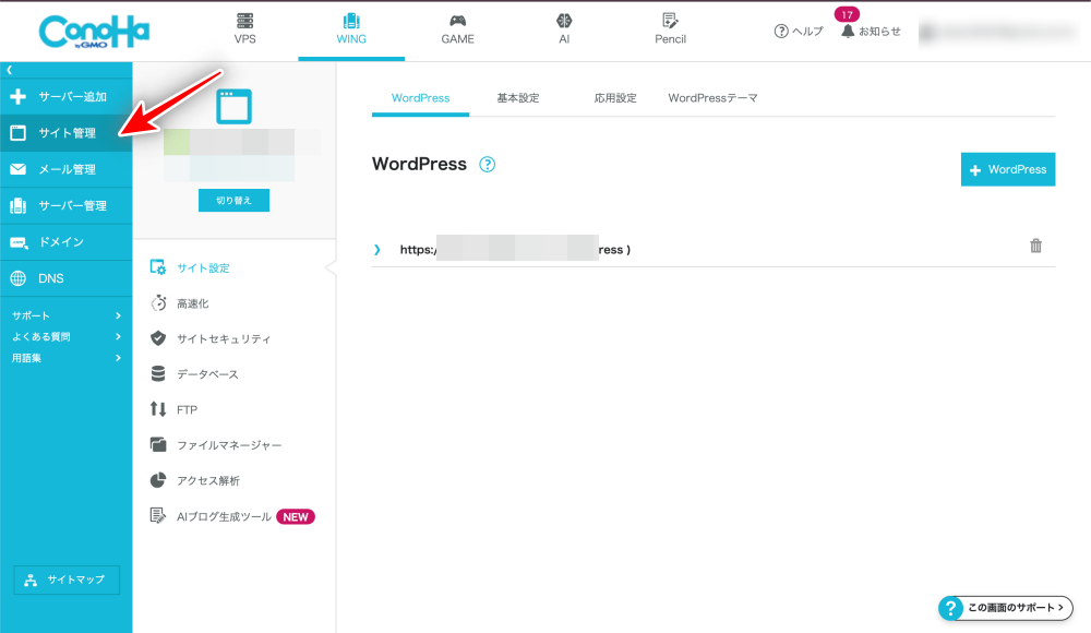 ログイン後、上部タブの「WING」を選び、「サイト管理」をクリックします。
