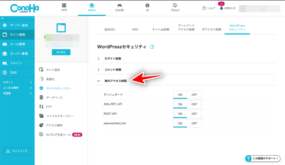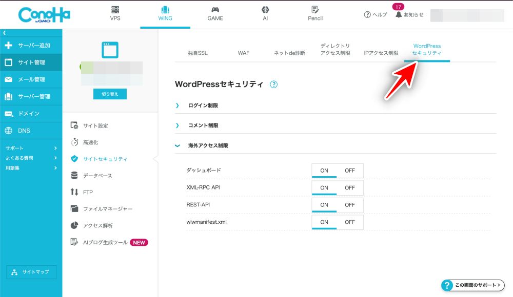 まず、ConoHaコントロールパネルの「WordPressセキュリティ → 海外アクセス制限」を確認します。