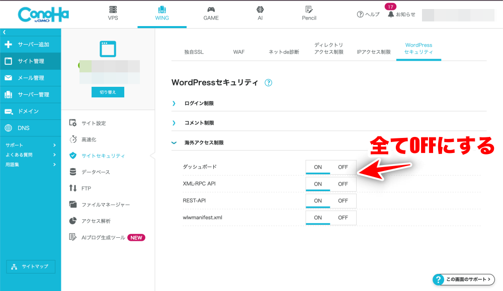 一時的に海外からアクセスする場合は、上記項目のうち必要なものだけ**「OFF」**にします。例えば管理画面のみアクセスしたい場合は「ダッシュボード」をOFFにします。